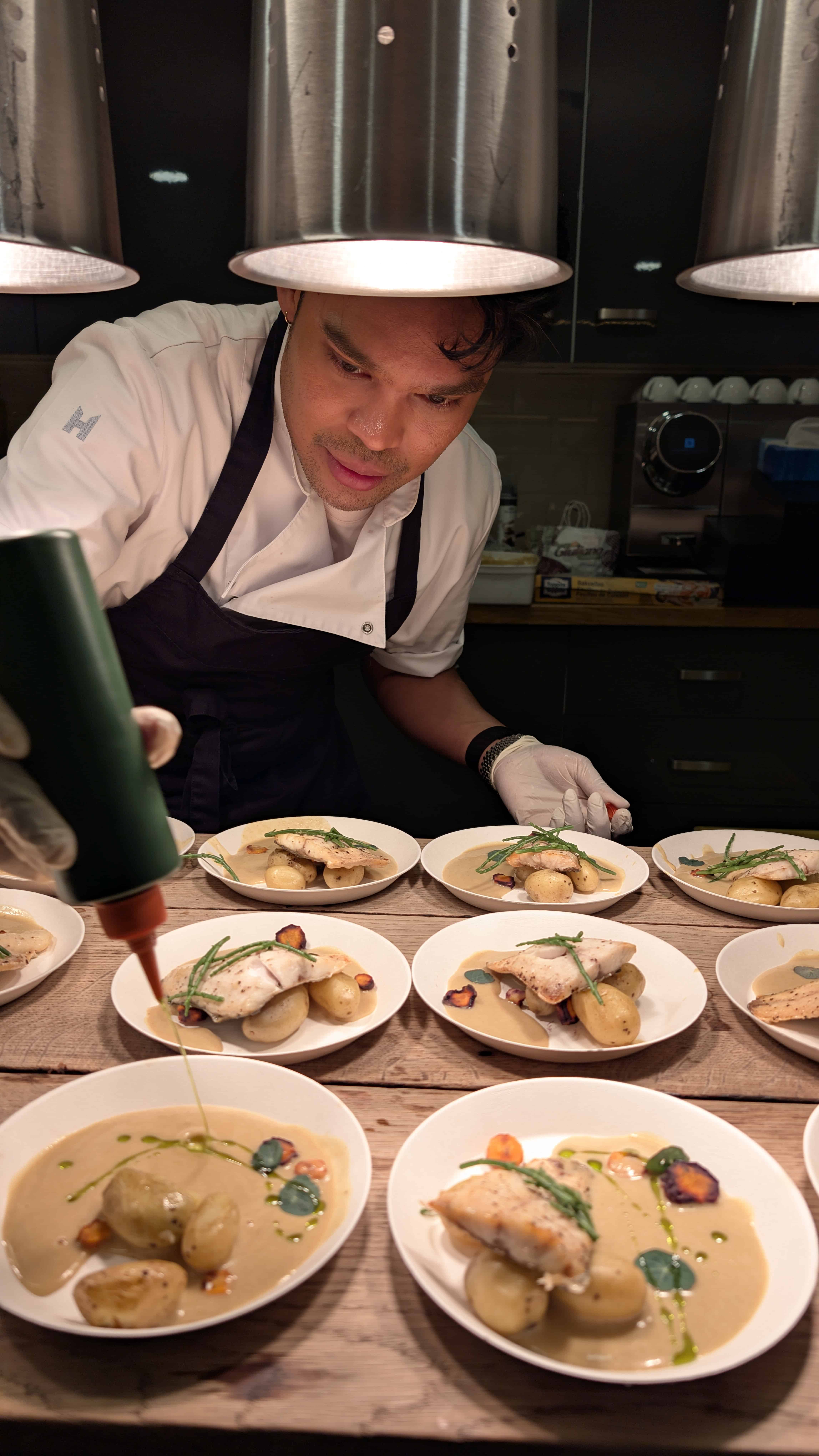 Fine dinning opmaak van borden met met kabeljauw, aardappelen, perterselie saus..